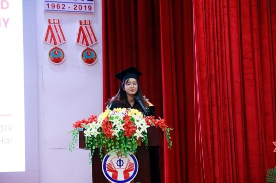 Trong buổi lễ trang trọng, bạn Phạm Phan Kỳ Duyên là một sinh viên xuất sắc đã được nhà trường lựa chọn để phát biểu cảm nghĩ bản thân về quá trình học tập tại trường, về bạn bè, gia đình và những gì đã trải qua.
