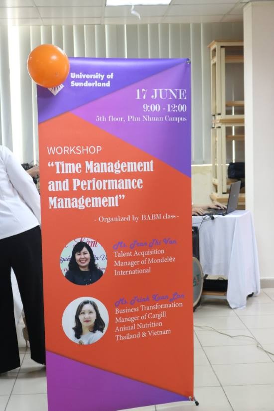 WORKSHOP “TIME MANAGEMENT AND PERFORMANCE MANAGEMENT”Sự kiện Workshop “Time Management and Performance Management” – Quản lí thời gian và quản trị hiệu suất được tổ chức bởi các bạn sinh viên năm cuối chương trình Cử nhân Quốc tế Đại học Sunderland nhằm phục vụ môn học Quản trị chiến lược nguồn nhân lực. Trải qua nhiều năm được đào tạo tại Việt Nam, sự kiện này đã mang đến không ít những thông tin bổ ích cho các bạn sinh viên năm cuối nói riêng và toàn thể sinh viên theo học Chương trình này nói chung.